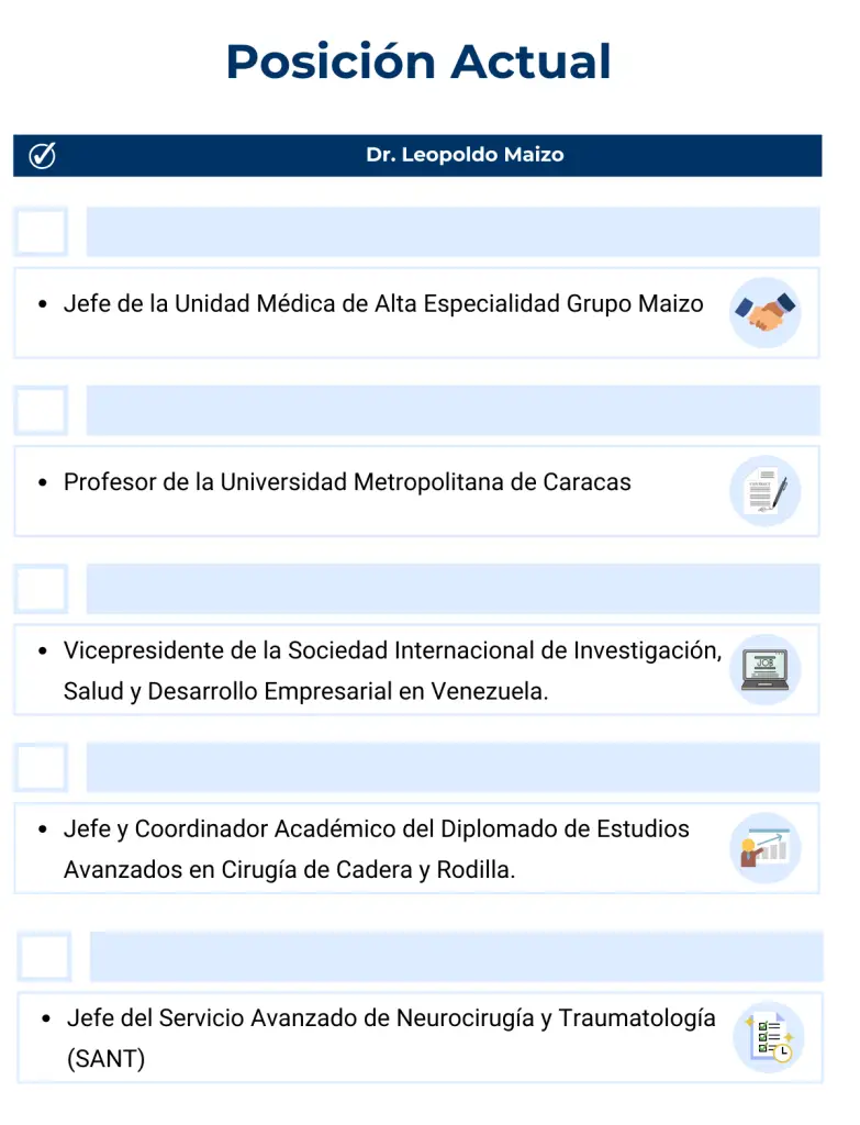 Es profesor certificado de la Universidad Metropolitana de Caracas y está especializado en cirugía de reemplazos articulares de cadera y rodilla. Entre sus áreas específicas de interés se encuentra el tratamiento de la artrosis de cadera y rodilla, fracturas de cadera y rodilla, la necrosis avascular de cadera y la cirugía por abordaje anterior en el reemplazo de cadera.