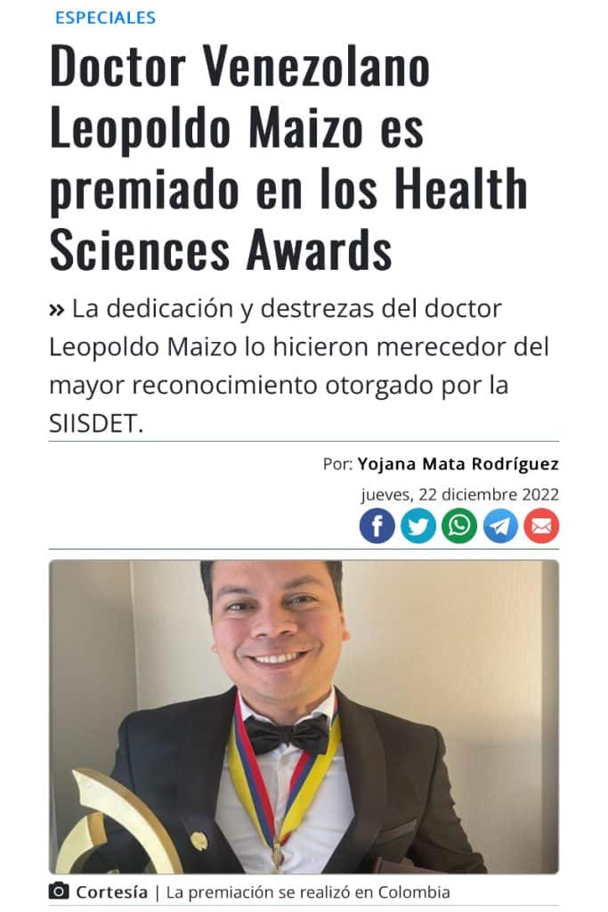 Dr. Maizo recibe en Colombia el premio como líder en investigación en la salud para el beneficio de la humanidad 2022-2023 por la SIISDET.